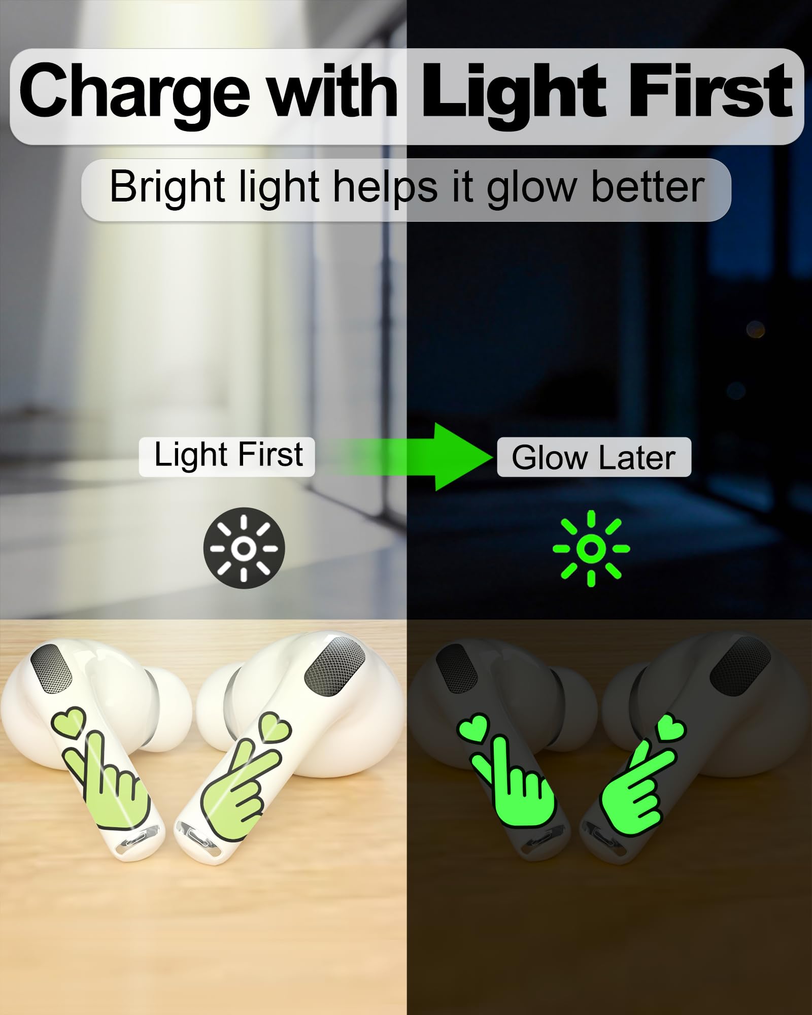 - Glow-in-the-dark skin sticker for AirPods earbuds. Looks great in daylight and helps you spot your AirPods faster at night—ideal for bedside, travel, and low-light rooms.