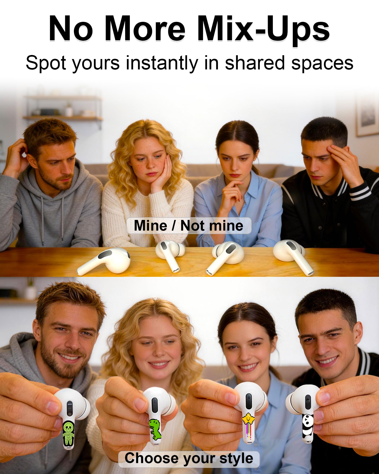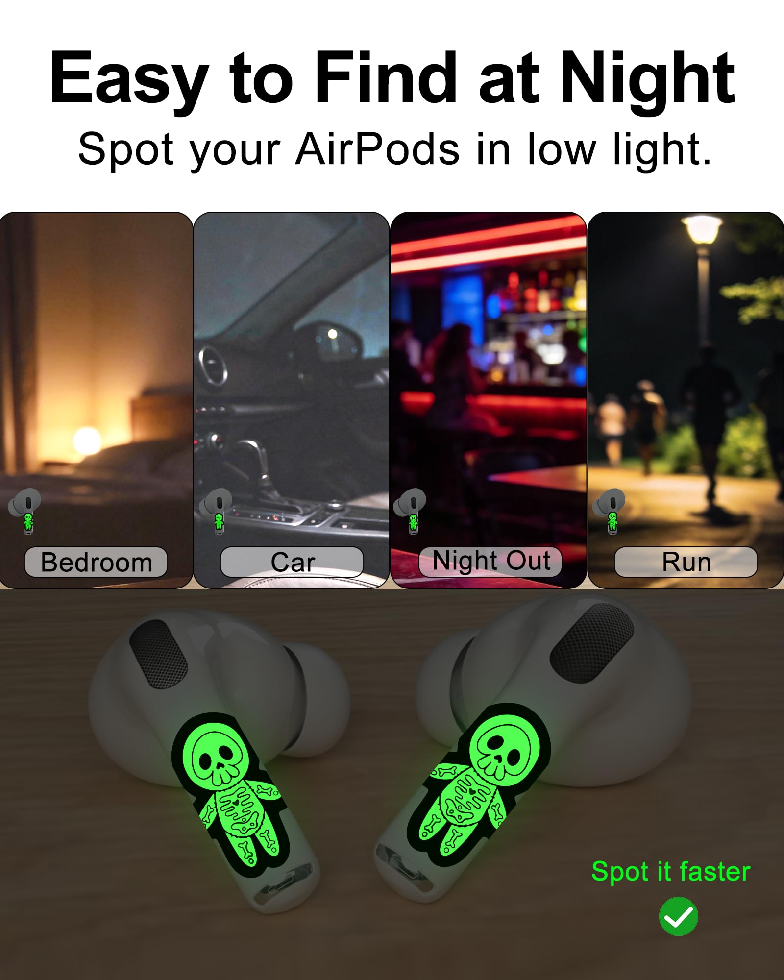 - Glow-in-the-dark skin sticker for AirPods earbuds. Looks great in daylight and helps you spot your AirPods faster at night—ideal for bedside, travel, and low-light rooms.