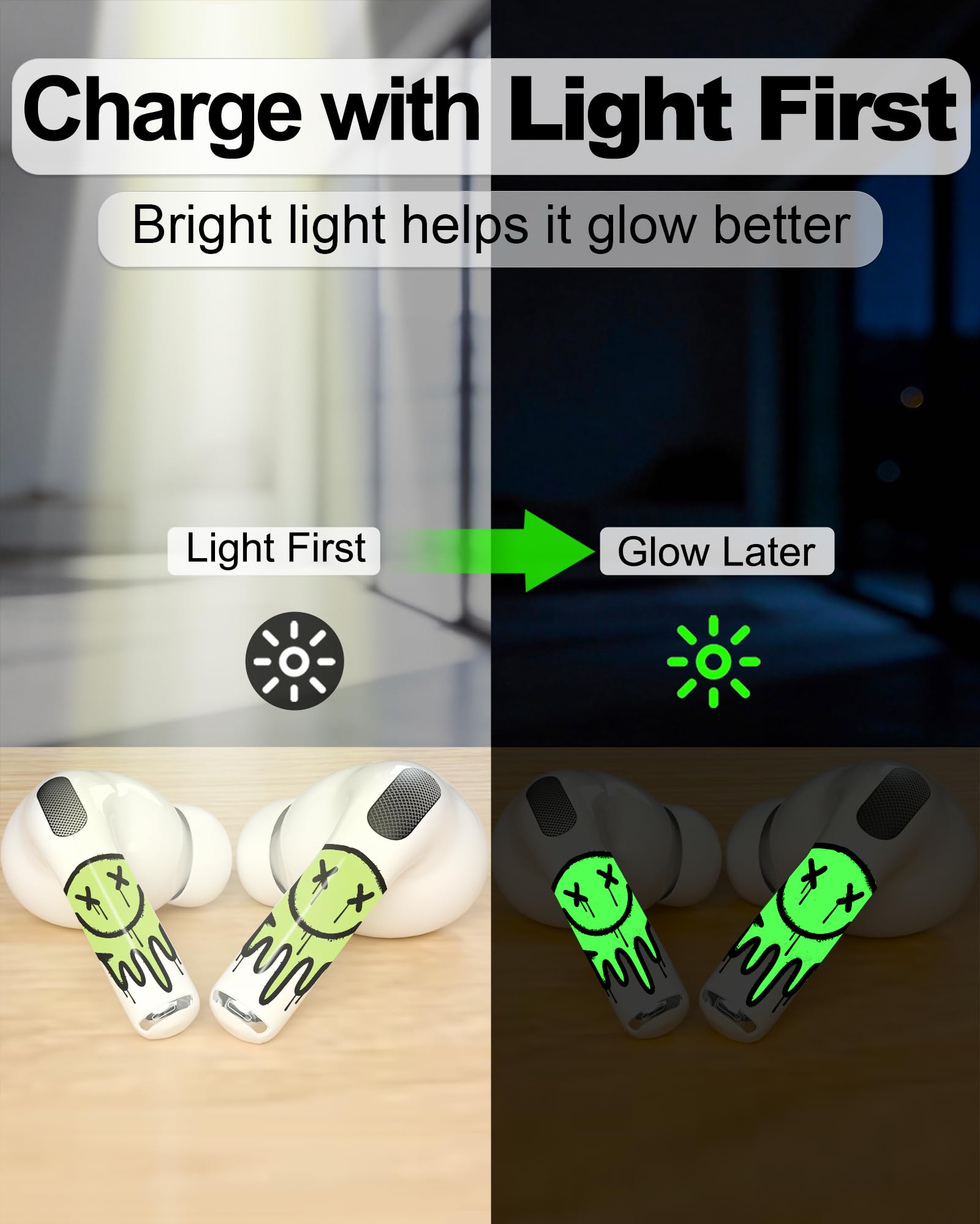 - Glow-in-the-dark skin sticker for AirPods earbuds. Looks great in daylight and helps you spot your AirPods faster at night—ideal for bedside, travel, and low-light rooms.