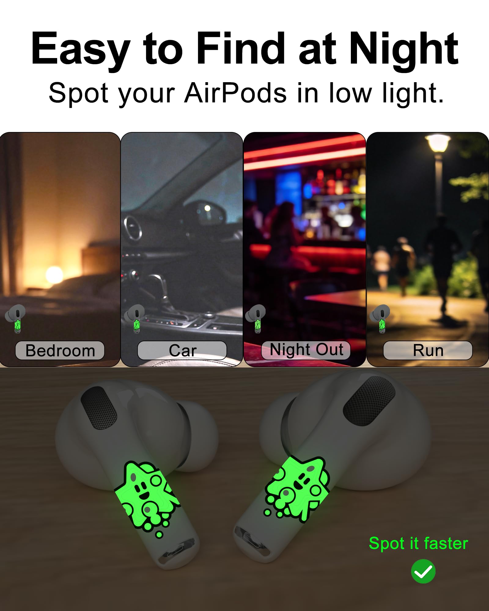 - Glow-in-the-dark skin sticker for AirPods earbuds. Looks great in daylight and helps you spot your AirPods faster at night—ideal for bedside, travel, and low-light rooms.